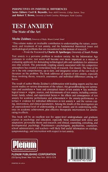 Examination stress and test anxiety are pervasive problems in modern society. As the information age continues to evolve, test scores will become even more important than they are today in evaluating applicants for demanding jobs and candidates for admission into highly competitive educational programs. Because test anxiety gen- ally causes decrements in performance and undermines academic achievement, the development of effective therapeutic interventions for reducing its adverse effects will continue to be an important priority for counselors, psychologists, and educators. Alleviating test anxiety will also serve to counteract the diminished access to edu- tional and occupational opportunities that is frequently experienced by test-anxious individuals. As its title promises, this volume provides a state-of-the-art evaluation of the nature, antecedents, correlates, and consequences of examination stress and test anxiety. Professor Zeidner's cogent and comprehensive analysis of the affective, cognitive, somatic, and behavioral manifestations of test anxiety are grounded in the extensive knowledge he has gained from his own research on the assessment and treatment of test anxiety. This work has also benefitted from the author's lo- standing and productive collaboration with leading contributors to test anxiety theory and research, and his active participation in national and international conferences devoted to understanding test anxiety, including those convened by the Society for Test Anxiety Research (STAR).