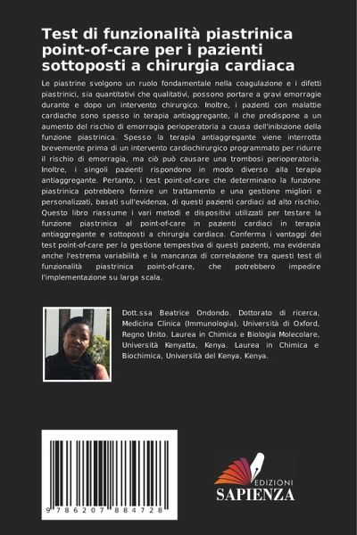 Le piastrine svolgono un ruolo fondamentale nella coagulazione e i difetti piastrinici, sia quantitativi che qualitativi, possono portare a gravi emorragie durante e dopo un intervento chirurgico. Inoltre, i pazienti con malattie cardiache sono spesso in terapia antiaggregante, il che predispone a un aumento del rischio di emorragia perioperatoria a causa dell'inibizione della funzione piastrinica. Spesso la terapia antiaggregante viene interrotta brevemente prima di un intervento cardiochirurgico programmato per ridurre il rischio di emorragia, ma ciò può causare una trombosi perioperatoria. Inoltre, i singoli pazienti rispondono in modo diverso alla terapia antiaggregante. Pertanto, i test point-of-care che determinano la funzione piastrinica potrebbero fornire un trattamento e una gestione migliori e personalizzati, basati sull'evidenza, di questi pazienti cardiaci ad alto rischio. Questo libro riassume i vari metodi e dispositivi utilizzati per testare la funzione piastrinica al point-of-care in pazienti cardiaci in terapia antiaggregante e sottoposti a chirurgia cardiaca. Conferma i vantaggi dei test point-of-care per la gestione tempestiva di questi pazienti, ma evidenzia anche l'estrema variabilità e la mancanza di correlazione tra questi test di funzionalità piastrinica point-of-care, che potrebbero impedire l'implementazione su larga scala.
