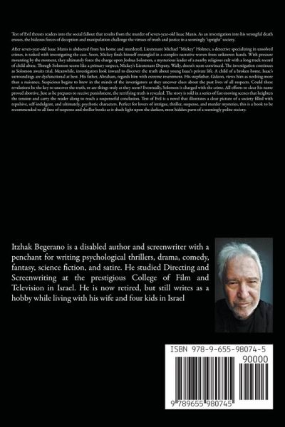 Test of Evil (based partly on true events) Genre : fiction, Psychological Thriller, Mystery, Suspense, Mental psychopathy, courtroom Test of Evil Thrusts Readers Into the Social Fallout That Results From the Murder of Seven-Year-old Isaac Manis. As an Investigation Into his Wrongful Death Ensues, the Hideous Forces of Deception and Manipulation Challenge the Virtues of Truth and Justice in a Seemingly "Upright" Society. After Seven-Year-old Isaac Manis is Abducted From his Home and Murdered, Lieutenant Michael "Mickey" Holmes, a Detective Specializing in Unsolved Crimes, is Tasked With Investigating the Case. Soon, Mickey Finds Himself Entangled in a Complex Narrative Woven From Unknown Hands. With Pressure Mounting by the Moment, They Ultimately Force the Charge Upon Joshua Solomon, a Mysterious Leader of a Nearby Religious Cult With a Long Track Record of Child Abuse. Though Solomon Seems Like a Primary Suspect, Mickey's Lieutenant Deputy, Wally, Doesn't Seem Convinced. The Investigation Continues as Solomon Awaits Trial. Meanwhile, Investigators Look Inward to Discover the Truth About Young Isaac's Private Life. A Child of a Broken Home, Isaac's Surroundings are Dysfunctional at Best. His Father, Abraham, Regards him With Extreme Resentment. His Stepfather, Gideon, Views him as Nothing More Than a Nuisance. Suspicious Begins to Brew in the Minds of the Investigators as They Uncover Clues About the Past Lives of all Suspects. Could These Revelations be the key to Uncover the Truth, or are Things Truly as They Seem? Eventually, Solomon is Charged With the Crime. All Efforts to Clear his Name Proved Abortive. Just as he Prepares to Receive Punishment, the Terrifying Truth is Revealed. The Story is Told in a Series of Fast-Moving Scenes That Heighten the Tension and Carry the Reader Along to Reach a Suspenseful Conclusion. Test of Evil is a Novel That Illustrates a Clear Picture of a Society Filled With Repulsive, Self-Indulgent, and Ultimately, Psychotic Characters. Perfect for Lovers of Intrigue, Thriller, Suspense, and Murder Mysteries, This is a Book to be Recommended to all Fans of Suspense and Thriller Books as it Sheds Light Upon the Darkest, Most Hidden Parts of Seemingly Polite Society.