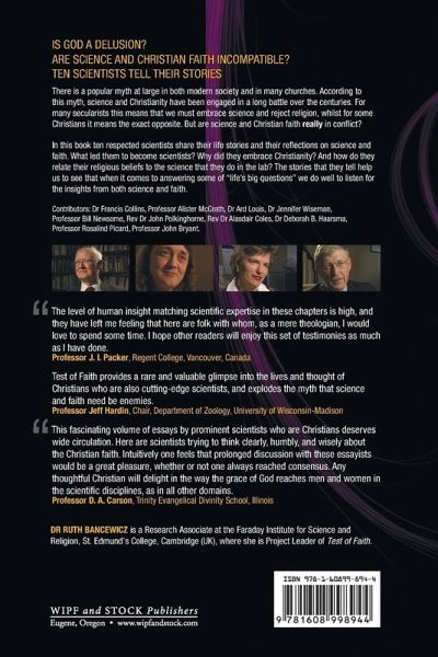 Is God a delusion? Are science and Christian faith incompatible? Ten scientists tell their stories. There is a popular myth at large in both modern society and in many churches. According to this myth, science and Christianity have been engaged in a long battle over the centuries. For many secularists this means that we must embrace science and reject religion, whilst for some Christians it means the exact opposite. But are science and Christian faith really in conflict? In this book ten respected scientists share their life stories and their reflections on science and faith. What led them to become scientists? Why did they embrace Christianity? And how do they relate their religious beliefs to the science that they do in the lab? The stories that they tell help us to see that when it comes to answering some of ""life's big questions"" we do well to listen for the insights from both science and faith. Samples and DVD trailer at www.testofaith.com Contributors Dr Francis Collins, Former Director, Human Genome Project Revd Dr Alasdair Coles, Cambridge University and St Andrews Church, Cambridge Dr Jennifer Wiseman, Astrophysicist, NASA Goddard Space Flight Center Prof. John Bryant, Professor Emeritus of Cell and Molecular Biology, Exeter University Prof. Bill Newsome, Professor of Neurobiology, Stanford University School of Medicine Prof. Rosalind Picard, Professor of Media Arts & Sciences, MIT Dr Ard Louis, The Rudolf Peierls Centre for Theoretical Physics, Oxford University Revd Dr John Polkinghorne, Former President of Queens' College, Cambridge Dr Deborah B. Haarsma, Associate Professor in Physics & Astronomy, Calvin College Prof. Alister McGrath, Professor of Historical Theology, Harris Manchester, College, Oxford Dr Ruth Bancewicz, The Faraday Institute for Science and Religion, St Edmund's College, Cambridge