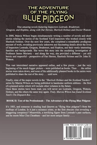 Nine amazing novels featuring Inspectors Lestrade, Bradstreet, Gregson, and Hopkins, along with Our Heroes, Sherlock Holmes and Doctor Watson In 2008, Marcia Wilson began simultaneously writing a number of novels and short stories relating the stories of the Scotland Yard Inspectors who worked closely with Sherlock Holmes. Over the next few years, she completed a remarkably prodigious amount of work, revealing previously unknown and fascinating details about the lives of Inspectors Lestrade, Gregson, Bradstreet, and Hopkins, and their vastly interesting families and backgrounds. She wove this story into the escalating investigation of Professor James Moriarty - and along the way, she provided a different - yet still heroic and respectful - perspective of Our Heroes, Sherlock Holmes and Dr. John H. Watson. This vast interrelated narrative appeared online, and a few pieces - just the very beginning of the much bigger picture - were published as books. Then . . . the online stories were taken down, and none of the additionally planned books in the series were published to share the rest of the story . . . until now. Finally, nine of the major novels in the "Sherlock Holmes and the Scotland Yarders" series by Marcia Wilson are being published in handsome uniform editions - the first of a planned series which will include other volumes in the future. Once these stories have been read, you will never see Lestrade, Gregson, Watson, Holmes, and the others the same way again. Truly, Marcia Wilson has found Scotland Yard's Tin Dispatch Box... BOOK II: Test of the Professionals - The Adventure of the Flying Blue Pidgeon It's 1883, and someone is stealing lead (known as "flying blue pidgeon") from the rooftops of London. Is it just a nuisance crime, or the first obscure clue revealing a staggering conspiracy? Meanwhile, a terrifying figure from Lestrade's past surfaces, and he meets Miss Clea Cheatham - and her most unique family.
