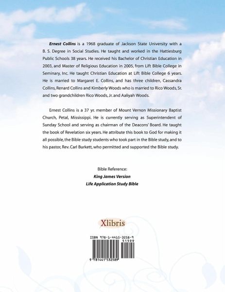 About The Author Ernest Collins is a1968 graduate of Jackson State University with a B. S. Degree in Social Studies. He taught and worked in the Hattiesburg Public Schools 38 years. He received his Bachelor of Christian Education in 2003, and Master of Religious Education in 2005, from Lift Bible College in Seminary, Inc. He taught Christian Education at Lift Bible College 6 years. He is married to Margaret E. Collins, and has three children, Cassandra Collins, Renard Collins and Kimberly Woods who is married to Rico Woods, Sr. and two grandchildren Rico Woods, Jr. and Aaliyah Woods. Ernest Collins is a 37yr. member of Mount Vernon Missionary Baptist Church, Petal, Mississippi. He is currently serving as Superintendent of Sunday School and serving as chairman of the Deacons' Board. He taught the book of Revelation six years. He attribute this book to God for making it all possible, the Bible study students who took part in the Bible study, and to his pastor, Rev. Carl Burkett, who permitted and supported the Bible study. Bible Reference: King James Version Life Application Study Bible