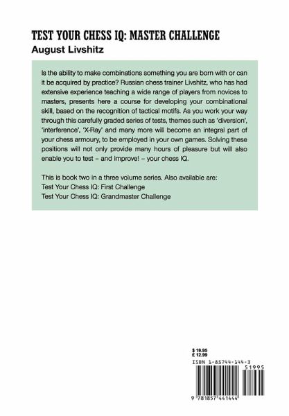 Is the ability to make combinations something you are born with or can it be acquired by practice? Russian chess trainer Livshitz, who has had extensive experience teaching a wide range of players from novices to masters, presents here a course for developing your combinational skill, based on the recognition of tactical motifs. As you work your way through this carefully graced series of tests, themes such as 'diversion, ' 'interference, ' 'X-Ray, ' and many more will become an integral part of your chess armoury, to be employed in your own games. Solving these positions will not only provide many hours of pleasure but will also enable you to test - and improve! - your chess IQ. This is book two in a three-volume series. Also available are: 'Test Your Chess IQ: First Challenge' and 'Test Your Chess IQ: Grandmaster Challenge.' (6 3/4' X 9 3/4', 122 pages, illustratio