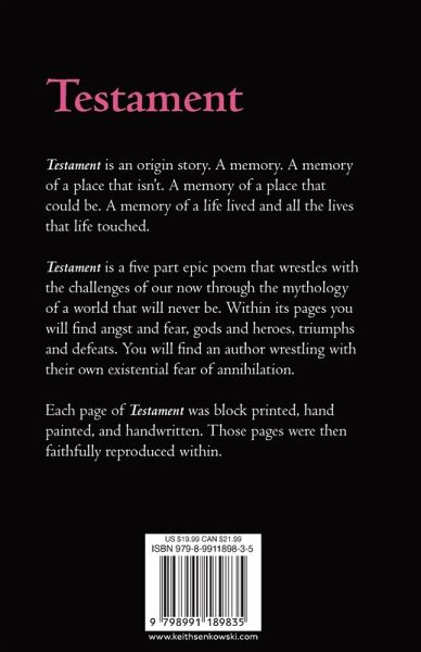 Testament is an origin story. A memory. A memory of a place that isn't. A memory of a place that could be. A memory of a life lived and all the lives that life touched. Testament is a five part epic poem that wrestles with the challenges of our now through the mythology of a world that will never be. Within its pages you will find angst and fear, gods and heroes, triumphs and defeats. You will find an author wrestling with their own existential fear of annihilation. Each page of Testament was block printed, hand painted, and handwritten. Those pages were then faithfully reproduced within.