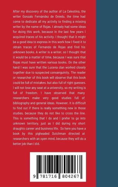 After my discovery of the author of La Celestina, the writer Gonzalo Fernández de Oviedo, the time had come to dedicate all my activity to finding a missing writer by the name of Rojas. I already had some ideas for doing this work, because in the last few years I acquired traces of his activity. I thought that it might be a good idea to express in this work how I fixed it to obtain traces of Fernando de Rojas and find his unknown books. A writer is a writer, so I thought that it would be a matter of time, because I was sure that Rojas must have written various books. On the other hand I was sure that the Lucena clan worked closely together due to suspected consanguinity. The reader or researcher of this book will observe that this book could be full of mistakes, but also full of right guesses. I will not lose any seat at a university, so my writing is full of freedom. I have observed that many researchers make very good studies full of bibliography and general ideas. However, it is difficult to find out if there is really something new in those studies, because they do not like to cross the line. This is something that I do and I prefer to go into unknown territory, just as I did during my short draughts career and business life.