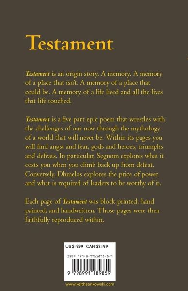 Testament is an origin story. A memory. A memory of a place that isn't. A memory of a place that could be. A memory of a life lived and all the lives that life touched. Testament is a five part epic poem that wrestles with the challenges of our now through the mythology of a world that will never be. Within its pages you will find angst and fear, gods and heroes, triumphs and defeats. You will find an author wrestling with their own existential fear of annihilation. Parts three and four, Segnom and Dhmelos, are found within this volume. Segnom explores what it costs you when you climb back up from defeat. What is required to stand up against evil and say no more. Conversely, Dhmelos explores the price of power and what is required of leaders to be worthy of it. Each page of Testament was block printed, hand painted, and handwritten. Those pages were then faithfully reproduced within.
