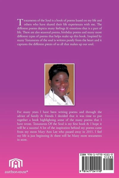 Testaments of the Soul is a book of poems based on my life and others who have shared their life experiences with me. Th e diff erent poems depicts many feelings & emotions that is a part of life. Th ere are also seasonal poems, birthday poems and many more diff erent types of poems that helps make up this book. Inspired by many Testaments of the soul is written purely from the heart and it captures the diff erent pieces of us all that makes up our soul.