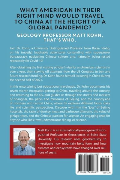 What American in their right mind would travel to China at the height of a global pandemic? Geology professor Matt Kohn, that's who. Join Dr. Kohn, a University Distinguished Professor from Boise, Idaho, on his (mostly) laughable adventures contending with superpower bureaucracy, navigating Chinese culture, and, naturally, being tested repeatedly for Covid-19! After obtaining the first visiting scholar's visa for an American scientist in over a year, then staving off attempts from the US Congress to ban any future research funding, Dr. Kohn found himself lecturing in China during the second half of 2021. In this entertaining but educational travelogue, Dr. Kohn documents his seven-month escapades getting to China, traveling around the country, and returning to the US, and guides us through the streets and markets of Shanghai, the parks and museums of Beijing, and the countryside of northern and central China, where he explores different foods, daily life, and scientific perspectives. Discover with him the "joys" of Beijing hospitals, the taste of donkey meat and barbecue silkworm, the value of ginkgo trees, and the Chinese passion for science. An engaging read for anyone who likes travel, adventurous dining, or science.