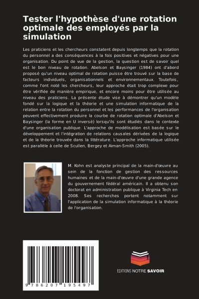 Les praticiens et les chercheurs constatent depuis longtemps que la rotation du personnel a des conséquences à la fois positives et négatives pour une organisation. Du point de vue de la gestion, la question est de savoir quel est le bon niveau de rotation. Abelson et Baysinger (1984) ont d'abord proposé qu'un niveau optimal de rotation puisse être trouvé sur la base de facteurs individuels, organisationnels et environnementaux. Toutefois, comme l'ont noté les chercheurs, leur approche était trop complexe pour être vérifiée de manière empirique, et encore moins pour être utilisée au niveau des praticiens. La présente étude vise à démontrer qu'un modèle fondé sur la logique et la théorie et une simulation informatique de la relation entre la rotation du personnel et les performances de l'organisation peuvent effectivement produire la courbe de rotation optimale d'Abelson et Baysinger (la forme en U inversé) lorsqu'ils sont étudiés dans le contexte d'une organisation publique. L'approche de modélisation est basée sur le développement et l'intégration de relations causales dérivées de la logique et de la théorie trouvée dans la littérature. L'approche informatique utilisée est parallèle à celle de Scullen, Bergey et Aiman-Smith (2005).