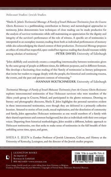 Testimonial Montage: A Family of Israeli Holocaust Testimonies from the Cracow Ghetto Resistance explores interconnected testimonies of four Holocaust survivors who were members of the Akiva youth group in Cracow, Poland, who participated in the ghetto resistance. Drawing on literary and photographic discourse, Jelen extracts the contours of personal narrative from the collective voice present in these interconnected testimonies. Attuned to stories of lost youth, sexual exploitation, and the dissolution of community and family, Jelen approaches Holocaust testimonies as one would members of a family with their shared experiences and common background, but also as individuals with their own unique voices. Departing from historical methodologies, Jelen models a different, wholistic approach to Holocaust testimonies, one which seeks to make sense of testimonies in the full breadth of their unfolding, across time, across space, and across genre.
