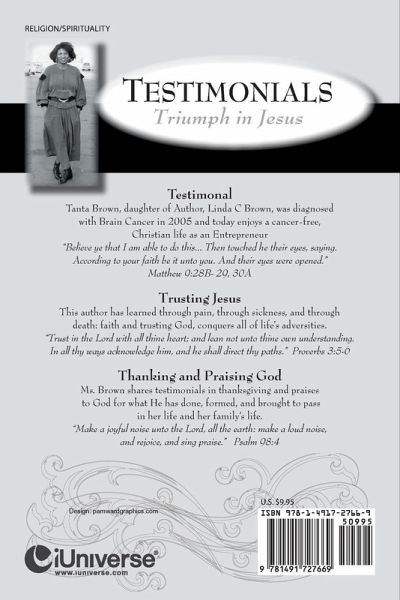 TESTIMONIALS Triumph in Jesus Testimonial Tanta Brown, daughter of Author, Linda Brown, was diagnosed with Brain Cancer in 2005 and today enjoys a cancer-free, Christian life as an Entrepreneur. "Believe ye that I am able to do this... Then touched he their eyes, saying. According to your faith to be it unto you. And their eyes were opened." Matthew 9:28B-29, 30A Trusting Jesus This author has learned through pain, through sickness, and through death: faith and trusting God, conquers all of life's adversities. "Trust in the Lord with all thine heart; and lean not unto thine own understanding. In all thy ways acknowledge him, and he shall direct thy paths." Proverbs 3:5-6 Thanking and Praising God Ms. Brown shares testimonials in thanksgiving and praises to God for what He has done, formed, and brought to pass in her life and her family's life. "Make a joyful noise unto the Lord, all the earth: make a loud noise, and rejoice, and sing praise." Psalm 98:4