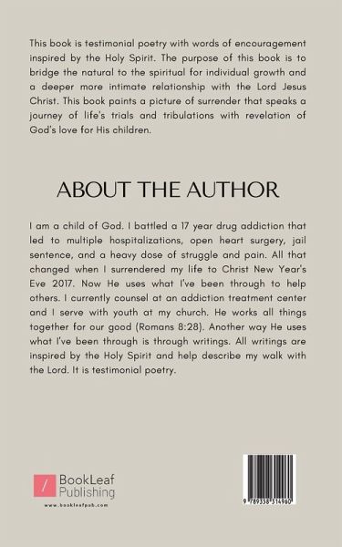 This book is testimonial poetry with words of encouragement inspired by the Holy Spirit. The purpose of this book is to bridge the natural to the spiritual for individual growth and a deeper more intimate relationship with the Lord Jesus Christ. This book paints a picture of surrender that speaks a journey of life's trials and tribulations with revelation of God's love for His children.