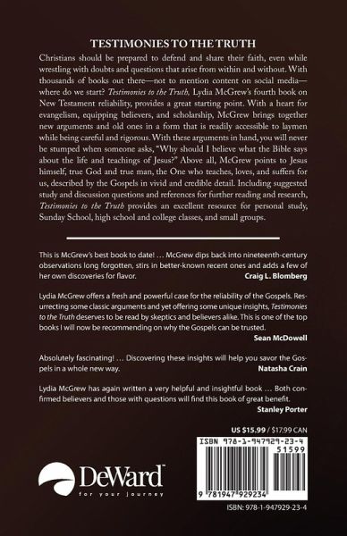 Christians should be prepared to defend and share their faith, even while wrestling with doubts and questions that arise from within and without. With thousands of books out there-not to mention content on social media-where do we start? Testimonies to the Truth, Lydia McGrew's fourth book on New Testament reliability, provides a great starting point. With a heart for evangelism, equipping believers, and scholarship, McGrew brings together new arguments and old ones in a form that is readily accessible to laymen while being careful and rigorous. With these arguments in hand, you will never be stumped when someone asks, "Why should I believe what the Bible says about the life and teachings of Jesus?" Above all, McGrew points to Jesus himself, true God and true man, the One who teaches, loves, and suffers for us, described by the Gospels in vivid and credible detail. Including suggested study and discussion questions and references for further reading and research, Testimonies to the Truth provides an excellent resource for personal study, Sunday School, high school and college classes, and small groups. Categories of evidence covered include:Undesigned coincidences-puzzle-like connections between the details in different Gospel stories. Little-known facts from outside the Bible that confirm details in the Gospels. Unexplained allusions and unnecessary details-little things that the authors mention apparently just because they are true. The personalities of Peter, Martha, and Mary in stories from different Gospels. The unified personality of Jesus himself.