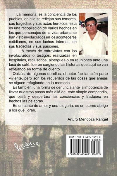 La memoria, es la conciencia de los pueblos, en ella se reflejan sus temores, sus tragedias y sus actos heroicos, esta es una recopilación de varios hechos en los que personajes de la vida urbana se han visto involucrados en los aconteceres cotidianos, en sus luchas internas, en sus tragedias y sus pasiones. A través de entrevistas con los involucrados o testigos, realizadas en hospitales, reclusorios, albergues o en reuniones ante una tasa de café, fueron surgiendo las historias que aquí se van reflejando en forma de cuento. Quizás, de algunas de ellas, el autor fue también parte viviente, pero son los recuerdos de las cosas que añejas se siguen refugiando en la memoria. Es también, una forma de denuncia ante la impotencia de llevar nuestros pasos más allá de este simple compendio, que ojalá y despertara las conciencias y tradujera en hechos las palabras. Es un canto de amor y una plegaria, es un eterno abrigo a los que lloran. Arturo Mendoza Rangel