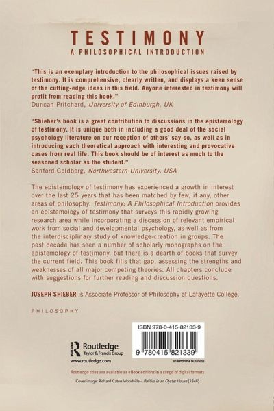 "The epistemology of testimony has experienced a growth in interest over the last twenty-five years that can be matched by few, if any, other areas of philosophy. Testimony: A Philosophical Introduction is an introduction to the epistemology of testimonythat surveys this rapidly growing research area while incorporating a discussion of relevant empirical work from social and developmental psychology, as well as from the study of knowledge creation in groups. The past decade has seen a number of books onthe epistemology of testimony, but there is a dearth of books that survey the current field. This book fills that gap, assessing the strengths and weaknesses of all major competing theories. All chapters conclude with Suggestions for Further Reading and Discussion Questions"--