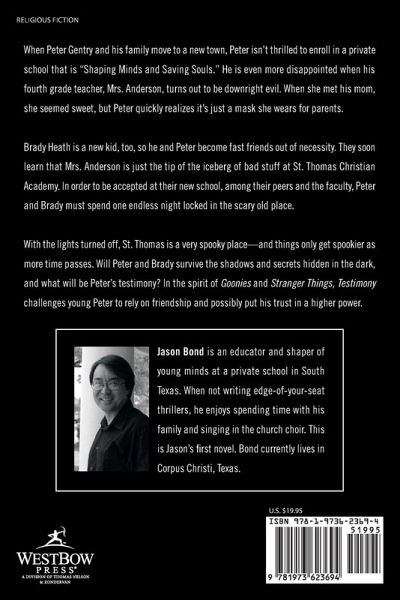 When Peter Gentry and his family move to a new town, Peter isn't thrilled to enroll in a private school that is Shaping Minds and Saving Souls. He is even more disappointed when his fourth grade teacher, Mrs. Anderson, turns out to be downright evil. When she met his mom, she seemed sweet, but Peter quickly realizes its just a mask she wears for parents. Brady Heath is a new kid, too, so he and Peter become fast friends out of necessity. They soon learn that Mrs. Anderson is just the tip of the iceberg of bad stuff at St. Thomas Christian Academy. In order to be accepted at their new school, among their peers and the faculty, Peter and Brady must spend one endless night locked in the scary old place. With the lights turned off, St. Thomas is a very spooky placeand things only get spookier as more time passes. Will Peter and Brady survive the shadows and secrets hidden in the dark, and what will be Peters testimony? In the spirit of Goonies and Stranger Things, Testimony challenges young Peter to rely on friendship and possibly put his trust in a higher power.