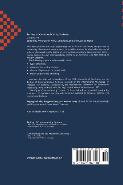 The aim of this book is to bring together the research of academics and practitioners in the field of communication systems testing. It covers four major topic areas; types of testing including conformance testing, inoperability testing, performance and QoS testing; phases of testing including test case generation, means of testing, test execution and test results analysis; classes of systems tested and the theory and practice of testing including test-related algorithms, practical testing methodology and practical testing experience.