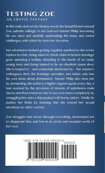 In this male-dom erotic fantasy novel, the beautiful and sensual Zoe submits willingly to her beloved Master Philip, becoming his sex slave and dutifully undertaking the many and varied challenges with which he tests her devotion. Her adventures include getting regularly spanked as she works topless in a bar; being taken to fetish clubs in bizarre bondage gear; spending a holiday attending to the needs of six randy young men; and being trained to be an obedient sauna slave. Master Philip also tests her by demanding she achieve a higher orgasm quota every day, a task assisted by the provision of dozens of submissive male slaves; and then immerses her in sex even more completely by smuggling her onto a ship packed with horny sailors. Finally he pushes her limits by insisting that she extend her sexual attentions to other women. Zoe struggles and strives through everything, determined not to disappoint him, and lost in an erotic and escapist world of her own.