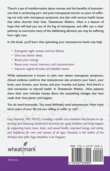 There's a sea of misinformation about women and the benefits of testosterone that is sentencing peri- and post-menopausal women to years of suffering not only with menopause symptoms, but also with serious health issues that often shorten their lives. Testosterone Matters…More is a beacon of hope that will lead you out of the fog of menopause, and offer you a clear pathway to overcome many of the debilitating ailments you may be suffering from right now. In this book, you'll learn that optimizing your testosterone levels may help: Extinguish night sweats and hot flashes Give you better sleep Boost your energy Boost your mood, memory, and concentration Improve vaginal dryness and bladder issues While testosterone is known to calm over eleven menopause symptoms, clinical evidence confirms that testosterone also protects your heart, your brain, your breasts, your bones, and your muscles and joints. And there's a vital connection to thyroid health. In Testosterone Matters…More patients share their own intimate stories about the astonishing changes that have made their lives better and happier. You do need hormones. You most definitely need testosterone. How many more years of your life are you willing to suffer or risk? If you answered NOT ONE MORE, keep reading and discover how testosterone is going to change your life.