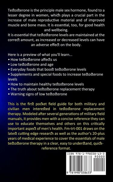 Testosterone is the principle male sex hormone, found to a lesser degree in women, which plays a crucial part in the increase of male reproductive material and of improved muscle and bone mass. It is essential, too, for good health and wellbeing. It is essential that testosterone levels are maintained at the correct amount, as increased or decreased levels can have an adverse effect on the body. Here is a preview of what you'll learn...How testosterone affects us Low testosterone and age Everyday foods that boost testosterone levels Supplements and special foods to increase testosterone levels How to maintain healthy testosterone levels The truth about testosterone replacement therapy Warning signs of low testosterone This is the first pocket field guide for both military and civilian men interested in testosterone replacement therapy. Modeled after several generations of military field manuals, it provides men with a concise reference they can use to educate themselves and others on this critically important aspect of men's health. Fm-trt-001 draws on the latest cutting edge research as well as the author's 20-plus years of medical experience to cover the essentials of male testosterone therapy in a clear, easy to understand, quick-reference format.