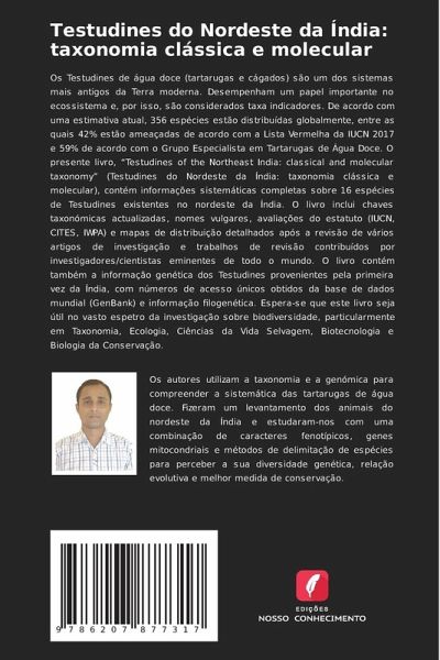 Os Testudines de água doce (tartarugas e cágados) são um dos sistemas mais antigos da Terra moderna. Desempenham um papel importante no ecossistema e, por isso, são considerados taxa indicadores. De acordo com uma estimativa atual, 356 espécies estão distribuídas globalmente, entre as quais 42% estão ameaçadas de acordo com a Lista Vermelha da IUCN 2017 e 59% de acordo com o Grupo Especialista em Tartarugas de Água Doce. O presente livro, ¿Testudines of the Northeast India: classical and molecular taxonomy¿ (Testudines do Nordeste da Índia: taxonomia clássica e molecular), contém informações sistemáticas completas sobre 16 espécies de Testudines existentes no nordeste da Índia. O livro inclui chaves taxonómicas actualizadas, nomes vulgares, avaliações do estatuto (IUCN, CITES, IWPA) e mapas de distribuição detalhados após a revisão de vários artigos de investigação e trabalhos de revisão contribuídos por investigadores/cientistas eminentes de todo o mundo. O livro contém também a informação genética dos Testudines provenientes pela primeira vez da Índia, com números de acesso únicos obtidos da base de dados mundial (GenBank) e informação filogenética. Espera-se que este livro seja útil no vasto espetro da investigação sobre biodiversidade, particularmente em Taxonomia, Ecologia, Ciências da Vida Selvagem, Biotecnologia e Biologia da Conservação.