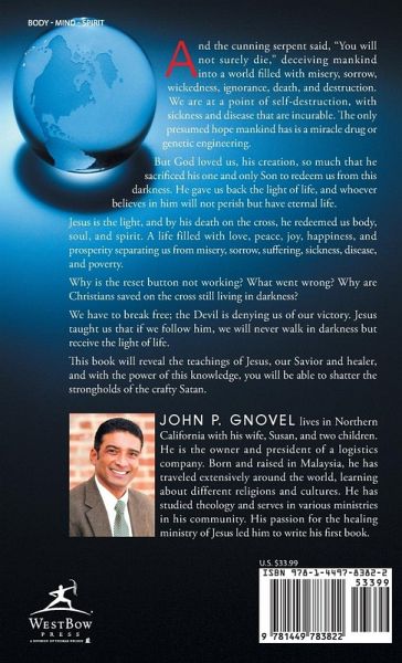 And the cunning serpent said, "You will not surely die," deceiving mankind into a world filled with misery, sorrow, wickedness, ignorance, death, and destruction. We are at a point of self-destruction, with sickness and disease that are incurable. The only presumed hope mankind has is a miracle drug or genetic engineering. But God loved us, his creation, so much that he sacrificed his one and only Son to redeem us from this darkness. He gave us back the light of life, and whoever believes in him will not perish but have eternal life. Jesus is the light, and by his death on the cross, he redeemed us body, soul, and spirit. A life filled with love, peace, joy, happiness, and prosperity separating us from misery, sorrow, suffering, sickness, disease, and poverty. Why is the reset button not working? What went wrong? Why are Christians saved on the cross still living in darkness? We have to break free; the Devil is denying us of our victory. Jesus taught us that if we follow him, we will never walk in darkness but receive the light of life. This book will reveal the teachings of Jesus, our Savior and healer, and with the power of this knowledge, you will be able to shatter the strongholds of the crafty Satan.