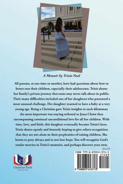 Memoirs by Trixie Neal All parents, at one time or another, have had questions about how to better rear their children, especially their adolescents. Trixie shares her family's private journey that some may never talk about in public. Their many difficulties included one of her daughters who presented a most unusual challenge. Her daughter yearned to have a baby at a very young age. Being a Christian gave Trixie insights to such dilemmas; the most important was staying tethered to Jesus Christ thus encompassing continual unconditional love for all her children. With time, love, and faith, this daughter eventually became Trixie's hero. Trixie shares openly and honestly hoping to give others recognition that they are not alone in their perplexities of raising children. She learns to pray always and to not lose hope. You will recognize God's tender mercies in Trixie's memoirs, and perhaps discover your own.