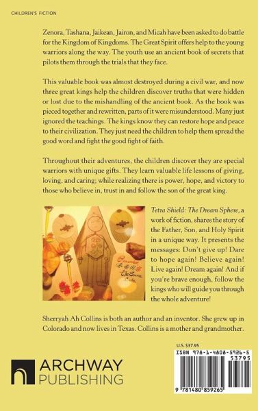 Zenora, Tashana, Jaikean, Jairon, and Micah have been asked to do battle for the Kingdom of Kingdoms. The Great Spirit offers help to the young warriors along the way. The youth use an ancient book of secrets that pilots them through the trials that they face. This valuable book was almost destroyed during a civil war, and now three great kings help the children discover truths that were hidden or lost due to the mishandling of the ancient book. As the book was pieced together and rewritten, parts of it were misunderstood. Many just ignored the teachings. The kings know they can restore hope and peace to their civilization. They just need the children to help them spread the good word and fight the good fight of faith. Throughout their adventures, the children discover they are special warriors with unique gifts. They learn valuable life lessons of giving, loving, and caring; while realizing there is power, hope, and victory to those who believe in, trust in and follow the son of the great king. Tetra Shield: The Dream Sphere, a work of fiction, shares the story of the Father, Son, and Holy Spirit in a unique way. It presents the messages: Dont give up! Dare to hope again! Believe again! Live again! Dream again! And if youre brave enough, follow the kings who will guide you through the whole adventure!