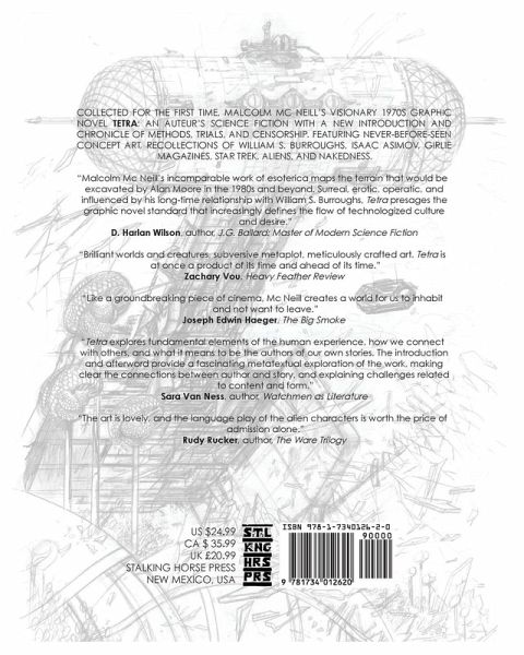 Collected for the first time, Malcolm Mc Neill's visionary 1970s graphic novel 'Tetra' - An auteur's science fiction with a new introduction and chronicle of methods, trials, and censorship. Featuring never-before-seen concept art, recollections of William S. Burroughs, Isaac Asimov, 'girlie' magazines, Stanley Kubrick, glue, Star Trek, aliens, and nakedness... "Tetra was a late 70s proto-cyberpunk transreal skin-mag SF epic serialized graphic novel starring a naked woman with no hair and a penchant for running-dialog wisecracks. The art is lovely, and language play of the alien characters is worth the price of admission alone." - Rudy Rucker "Star Wars, Stranger in a Strange Land, Dune were all about the messianic 'Chosen One' - the individual come to save the world. I just wanted a heroine who said f*ck all that." - Malcolm Mc Neill