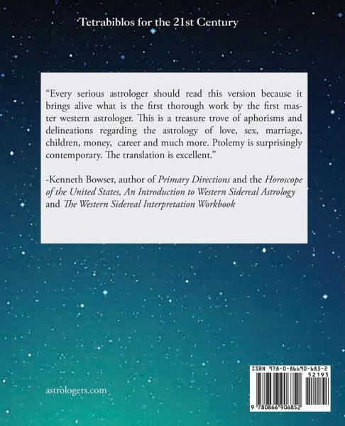 Ptolemy's ancient all-in-one astrology manual, Tetrabiblos because it has "four books" or sections, . Astrologers have long called it "the bible of astrology." Claudius Ptolemy of Egypt wrote the book late in his life, which was about 150 years after Christ, compiling and organizing what his ancient world knew about predictive astrology--an art and science that might have been lost to us except that handwritten copies of Tetrabiblos survived in Greek, Arabic, and Latin, because even when astrology was forbidden there were always those who against the rules could appreciate it. Ptolemy was an astronomer and astrologer when those disciplines were one. From his many other books we know he was above all a scientist and mathematician who believed in logic and order, and he saw--he proved--the mathematical basis of planetary motion Tetrabiblos combines science and art to explain how stars and planets yield meaning. This book laid the foundation for Western astrology as it is practiced today. Scholars who can read the original Greek admire Ptolemy as a mathematician and scientist, yet agree that he was not a good writer. In fact Tetrabiblos was such difficult reading that by the ninth century C.E. another writer had paraphrased the book to make it more readable. Preserved in an Arabic manuscript, this "Paraphrase of Proclus" is the oldest surviving version of Tetrabiblos. Compared with the full text, it cuts corners and contains inaccuracies. This new translation is the full text, adapted from the two most recent English translations, published in 1822 and 1940.