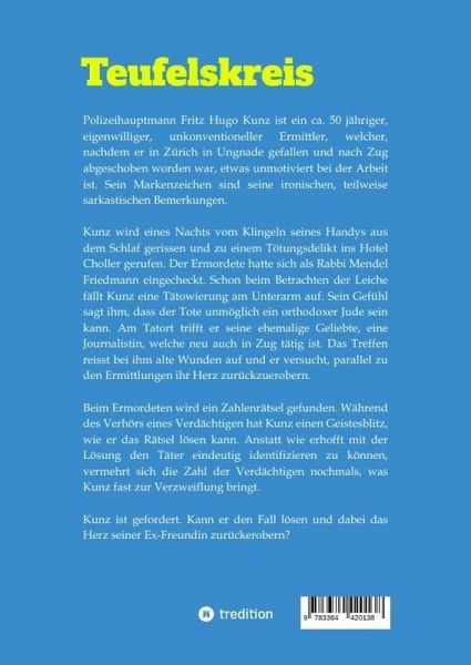 Polizeihauptmann Fritz Hugo Kunz ist ein ca. 50 jähriger, eigenwilliger, unkonventioneller Ermittler, welcher, nachdem er in Zürich in Ungnade gefallen und nach Zug abgeschoben worden war, etwas unmotiviert bei der Arbeit ist. Sein Markenzeichen sind seine ironischen, teilweise sarkastischen Bemerkungen.Kunz wird eines Nachts vom Klingeln seines Handys aus dem Schlaf gerissen und zu einem Tötungsdelikt ins Hotel Choller gerufen. Der Ermordete hatte sich als Rabbi Mendel Friedmann eingecheckt. Schon beim Betrachten der Leiche fällt Kunz eine Tätowierung am Unterarm auf. Sein Gefühl sagt ihm, dass der Tote unmöglich ein orthodoxer Jude sein kann. Am Tatort trifft er seine ehemalige Geliebte, eine Journalistin, welche neu auch in Zug tätig ist. Das Treffen reisst bei ihm alte Wunden auf und er versucht, parallel zu den Ermittlungen ihr Herz zurückzuerobern.Beim Ermordeten wird ein Zahlenrätsel gefunden. Während des Verhörs eines Verdächtigen hat Kunz einen Geistesblitz, wie er das Rätsel lösen kann. Anstatt wie erhofft mit der Lösung den Täter eindeutig identifizieren zu können, vermehrt sich die Zahl der Verdächtigen nochmals, was Kunz fast zur Verzweiflung bringt.Kunz ist gefordert. Kann er den Fall lösen und dabei das Herz seiner Ex-Freundin zurückerobern?
