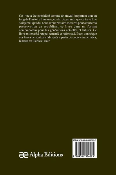 Teverino" est un livre classique, qui a eu une valeur significative tout au long de l'histoire, et pour garantir que sa sagesse intemporelle ne soit jamais perdue, Alpha Editions l'a soigneusement préservé en le republiant dans un format moderne et accessible aux générations présentes et futures. Soigneusement reformaté, retapé , et nouvellement conçue, cette édition offre un texte clair et lisible, sans copies numérisées de l'uvre originale, Alpha Editions se consacre à insuffler une nouvelle vie aux livres anciens et classiques, rendant ces trésors littéraires à nouveau disponibles pour les lecteurs qui chérissent l'histoire. culture et savoir intemporel.