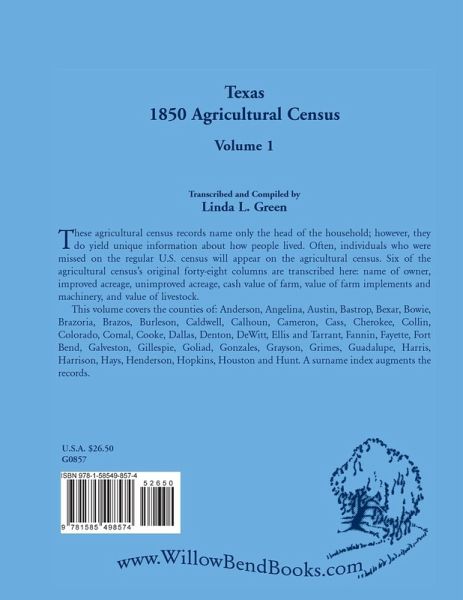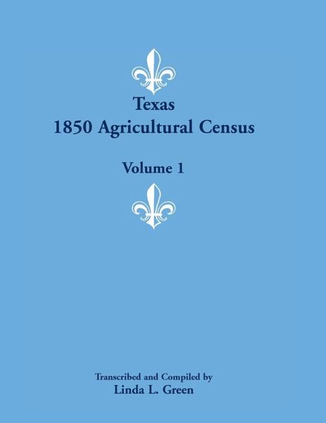 These agricultural census records name only the head of the household; however, they do yield unique information about how people lived. Often, individuals who were missed on the regular U.S. census will appear on the agricultural census. Six of the agricultural census's original forty-eight columns are transcribed here: name of owner, improved acreage, unimproved acreage, cash value of farm, value of farm implements and machinery, and value of livestock. This volume covers the counties of: Anderson, Angelina, Austin, Bastrop, Bexar, Bowie, Brazoria, Brazos, Burleson, Caldwell, Calhoun, Cameron, Cass, Cherokee, Collin, Colorado, Comal, Cooke, Dallas, Denton, DeWitt, Ellis and Tarrant, Fannin, Fayette, Fort Bend, Galveston, Gillespie, Goliad, Gonzales, Grayson, Grimes, Guadalupe, Harris, Harrison, Hays, Henderson, Hopkins, Houston and Hunt. A surname index augments the records.
