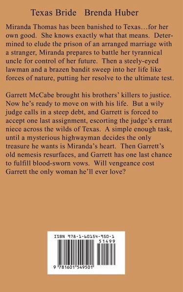 Miranda Thomas has been banished to Texas...for her own good. She knows exactly what that means. Determined to elude the prison of an arranged marriage with a stranger, Miranda prepares to battle her tyrannical uncle for control of her future. Then a steely-eyed lawman and a brazen bandit sweep into her life like forces of nature, putting her resolve to the ultimate test. Garrett McCabe brought his brothers' killers to justice. Now he's ready to move on with his life. But a wily judge calls in a steep debt, and Garrett is forced to accept one last assignment, escorting the judge's errant niece across the wilds of Texas. A simple enough task, until a mysterious highwayman decides the only treasure he wants is Miranda's heart. Then Garrett's old nemesis resurfaces, and Garrett has one last chance to fulfill blood-sworn vows. Will vengeance cost Garrett the only woman he'll ever love?