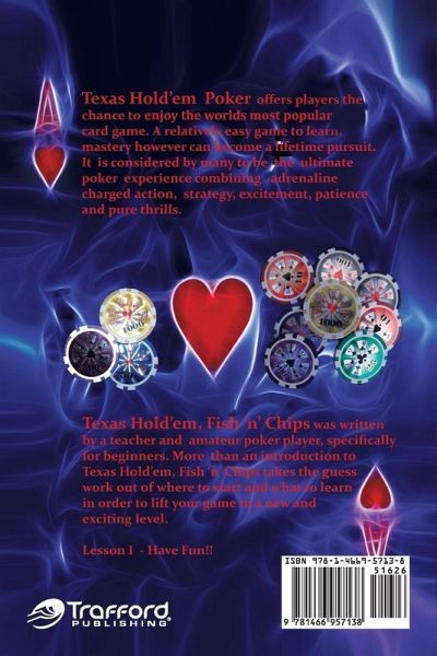 Texas Hold 'em, Fish 'n' Chips was written by a teacher and amateur poker player, specifically for beginners. More than an introduction to Texas Hold 'em, Fish 'n' Chips takes the guess work out of where to start and what to learn in order to lift your Texas Hold 'em no limit poker game to a new and exciting level. Texas Hold 'em poker offers players the chance to experience the world's most popular card game. A relatively easy game to learn, mastery however can become a lifetime pursuit. It is considered by many to be the ultimate poker experience combining adrenaline charged action, strategy, excitement, patience and pure thrills.