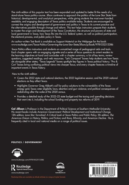 For instructors and students of state and local politics, the ninth edition of this book approaches Texas politics from historical, developmental, and analytical perspectives.