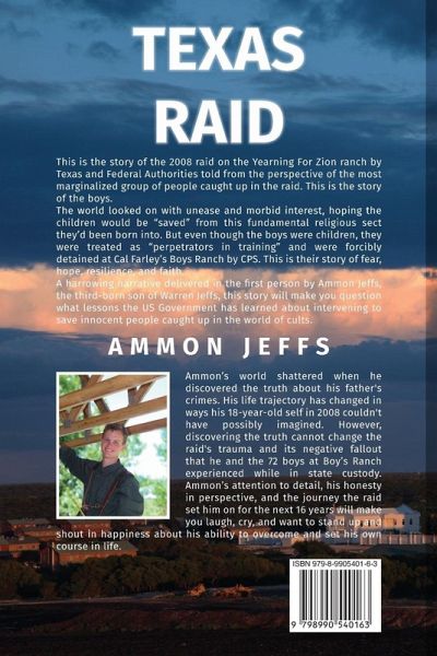 This is the story of the 2008 raid on the Yearning For Zion ranch by Texas and Federal Authorities told from the perspective of the most marginalized group of people caught up in the raid. This is the story of the boys. The world looked on with unease and morbid interest, hoping the children would be "saved" from this fundamental religious sect they'd been born into. But even though the boys were children, they were treated as "perpetrators in training" and were forcibly detained at Cal Farley's Boys Ranch by CPS. This is their story of fear, hope, resilience, and faith. A harrowing narrative delivered in the first person by Ammon Jeffs, the third-born son of Warren Jeffs, this story will make you question what lessons the US Government has learned about intervening to save innocent people caught up in the world of cults. Ammon's world shattered when he discovered the truth about his father's crimes. His life trajectory has changed in ways his 18-year-old self in 2008 couldn't have possibly imagined. However, discovering the truth cannot change the raid's trauma and its negative fallout that he and the 72 boys at Boy's Ranch experienced while in state custody. Ammon's attention to detail, his honesty in perspective, and the journey the raid set him on for the next 16 years will make you laugh, cry, and want to stand up and shout in happiness about his ability to overcome and set his own course in life.