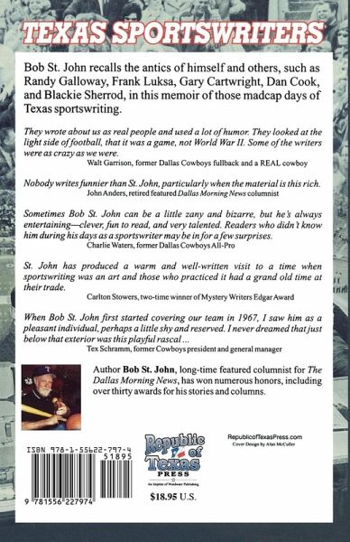 Bob St. John has been writing about Texas and the pro sports scene in Dallas for about 40 years. In the early years of sports reporting, the hijinks and shenanigans of Texas sports reporters were as legendary as the athletes they followed. St. John - innocent-looking, typical nice guy - was a leader and instigator of so much mischief that he and his fellow journalists were finally banned from staying in the same hotel as the teams. The book is filled with hilarious stories about every well-known sports writer in the state. Written in Bob's unmistakably witty style, this is a book that every reader of the sports page will love!