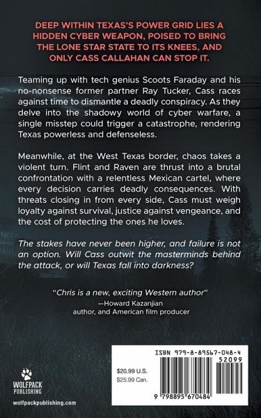 Deep within Texas's power grid lies a hidden cyber weapon, poised to bring the Lone Star State to its knees, and only Cass Callahan can stop it. Teaming up with tech genius Scoots Faraday and his no-nonsense former partner Ray Tucker, Cass races against time to dismantle a deadly conspiracy. As they delve into the shadowy world of cyber warfare, a single misstep could trigger a catastrophe, rendering Texas powerless and defenseless. Meanwhile, at the West Texas border, chaos takes a violent turn. Flint and Raven are thrust into a brutal confrontation with a relentless Mexican cartel, where every decision carries deadly consequences. With threats closing in from every side, Cass must weigh loyalty against survival, justice against vengeance, and the cost of protecting the ones he loves. The stakes have never been higher, and failure is not an option. Will Cass outwit the masterminds behind the attack, or will Texas fall into darkness? Dive into this heart-pounding contemporary Western thriller and experience the grit, suspense, and explosive action of Book 5 in the Cass Callahan series.