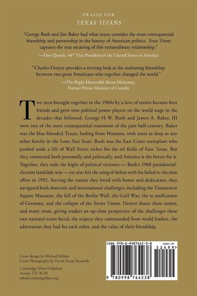 George H.W. Bush and James A. Baker, III: A Personal and Political Friendship for the Ages The friendship between George H.W. Bush and James A. Baker, III began over fifty years ago on the tennis courts of the Houston Country Club when they found themselves paired as a doubles team, winning back-to-back championships in 1966 and 1967. While both men were admittedly weak servers, Bush was the net-and-volley guy, with Baker holding down the baseline with his groundstroke skills. That same approach of complementary skill sets and teamwork spilled over into their political careers for decades to come. Both men's résumés were legendary. Bush served as a United States congressman, ambassador to the United Nations, chair of the Republican National Committee, US liaison to China, director of Central Intelligence, 43rd vice president, and 41st president of the United States. Baker served as undersecretary of commerce, secretary of the treasury, secretary of state, and White House chief of staff — twice, while also chairing or playing a lead role in five successive presidential elections for three different candidates from 1976 to 1992. Texas Titans is a story of George Herbert Walker Bush and James Addison Baker, III, two of America's most consequential statesmen of the past fifty years. Two men from opposite areas of the country who found friendship on the tennis courts at the Houston Country Club. Two men who helped transform a world during an era of immense challenges and change. Two men who became — and still are — Texas titans. Excerpts from Texas Titans: On Bush's Consequential Presidency: A sea of change engulfed the world during Bush's single term as president, testing his resolve like never before as a series of cascading events unfolded. The Berlin Wall — a symbol of human oppression — was torn down after thirty years. Saddam Hussein invaded tiny neighboring Kuwait, throwing the Middle East into turmoil and panic. Mikhail Gorbachev, the leader of the Soviet Union, was placed under house arrest in an attempted coup. And the Soviet Union ceased to exist on December 26, 1991. Events no historian or political operative could have accurately predicted, nevertheless, moments in history that placed George Herbert Walker Bush and James Addison Baker, III front and center on the world stage. On the 1992 Presidential Election: Baker admits that the loss "was devastating. He [George H.W. Bush] was devastated by that loss." Baker is also quick to point out that "I read a lot . . . comments, pundits and so forth saying, he lost because he broke his no-new-taxes pledge. That's not why he lost. . . . Everybody ought to get that straight. I ran that campaign, and I saw it every day in the polling. He lost because of a little guy from Dallas, Texas, called Ross Perot, who took nineteen percent of the vote. And we knew from our polling he [Perot] was taking two out of every three votes from us. We got 38, Clinton got 43. You add two-thirds of 19 to 38, and we get 51." On Friendship: "I have always been proud that George Bush used to describe our relationship as one of big brother and little brother. He used to say that one of the things he liked best about me was that I would always tell him what I thought, even when I knew he didn't want to hear it. Then we would have a spirited discussion about that issue." "But he had a very effective way of letting me know when the discussion was over," he continued. "He would look at me and say, 'Baker, if you're so smart, why am I president and you're not?'"