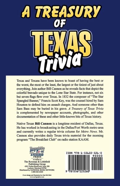 Texas and Texans have been known to boast of having the best or the worst, the most or the least, the largest or the tiniest of just about everything. Join author Bill Cannon as he reveals facts that depict the colorful bravado unique to the Lone Star State. For instance, no six but seven flags flew over Texas. In 1832 the composer of The Star Spangled Banner, Francis Scott Key, was the cousel hired by Sam Houston to defend him on assault charges. And someone other than Sam Bass may be buried in his grave. A Treasury of Texas Trivia is complemented by newspaper accounts, photographs, and other documentation of these and other little-known bits of Texas history.