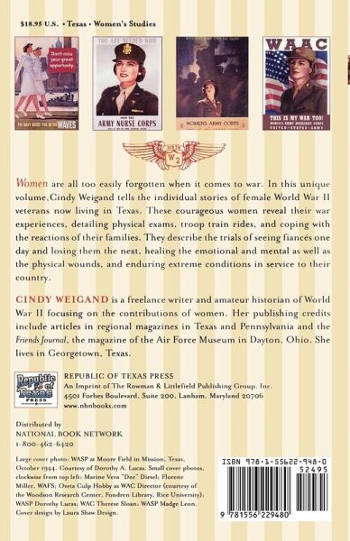 In this unique work, author Cindy Weigand chronicles the personal experiences of various female veterans during World War II. Now residing in Texas, these courageous women tell their individual stories, describing such experiences as enduring troop train rides and physical exams. They share personal hardships such as the loss of loved ones and the difficulty of recovery, both emotionally and physically, from the rigors and demands of war. In a time when women were easily brushed aside and ignored, Weigand focuses on the strength of these extraordinary Americans determined to serve their country.