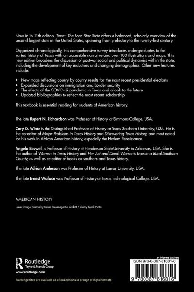 Now in its 11th edition, Texas: The Lone Star State offers a balanced, scholarly overview of the second largest state in the United States, spanning from prehistory to the twenty-first century. Organized chronologically, this comprehensive survey introduces undergraduates to the varied history of Texas with an accessible narrative and over 100 illustrations and maps. This new edition broadens the discussion of postwar social and political dynamics within the state, including the development of key industries and changing demographics. Other new features include: New maps reflecting county by county results for the most recent presidential elections Expanded discussions on immigration and border security The effects of the COVID-19 pandemic in Texas and a look to the future Updated bibliographies to reflect the most recent scholarship This textbook is essential reading for students of American history.