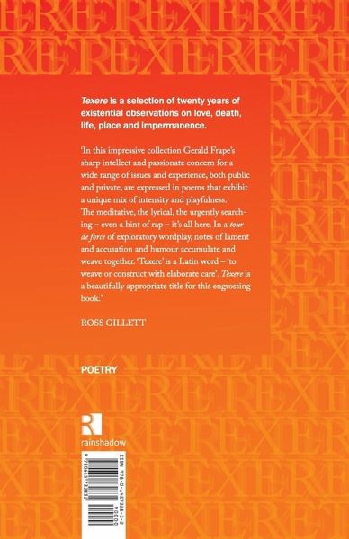 Texere is a selection of twenty years of existential observations on love, death, life, place and impermanence. 'In this impressive collection Gerald Frape's sharp intellect and passionate concern for a wide range of issues and experience, both public and private, are expressed in poems that exhibit a unique mix of intensity and playfulness. The meditative, the lyrical, the urgently searching - even a hint of rap - it's all here. In a tour de force of exploratory wordplay, notes of lament and accusation and humour accumulate and weave together. 'Texere' is a Latin word - 'to weave or construct with elaborate care.' Texere is a beautifully appropriate title for this engrossing book.' - Ross Gillett