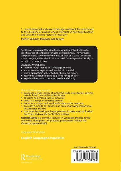 A practical, `user-friendly' guide to the issues and methods associated with text and discourse analysis. Text and Discourse Analysis: * examines a wide variety of authentic texts including news stories, adverts, novels, official forms, instruction manuals and textbooks * contains numerous practical activities * looks at a range of cohesive devices * concludes by looking at larger patterns in texts, a set of further exercises and a guide for further reading * provides a hands-on guide to an area of growing importance in language study.