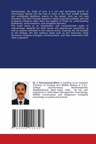 Myrmecology, the study of ants, is a rich and fascinating branch of entomology, delving into the lives of some of the most socially complex and ecologically significant insects on the planet. Ants are not only abundant, but their intricate behaviors, highly organized societies, and vast ecological influence make them key subjects of study for understanding biodiversity, social evolution, and ecosystem dynamics.This book serves as an introduction and comprehensive guide to myrmecology, designed for both novice and experienced researchers, as well as anyone interested in the natural world. Covering the full breadth of ant biology, the text explores topics such as ant taxonomy, social structures, foraging strategies, communication, and their interactions with other organisms.