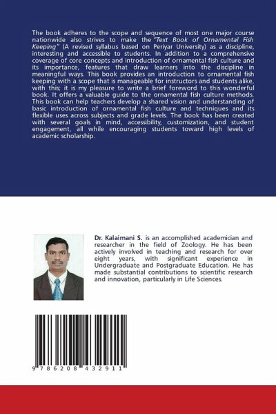 The book adheres to the scope and sequence of most one major course nationwide also strives to make the "Text Book of Ornamental Fish Keeping" (A revised syllabus based on Periyar University) as a discipline, interesting and accessible to students. In addition to a comprehensive coverage of core concepts and introduction of ornamental fish culture and its importance, features that draw learners into the discipline in meaningful ways. This book provides an introduction to ornamental fish keeping with a scope that is manageable for instructors and students alike, with this; it is my pleasure to write a brief foreword to this wonderful book. It offers a valuable guide to the ornamental fish culture methods. This book can help teachers develop a shared vision and understanding of basic introduction of ornamental fish culture and techniques and its flexible uses across subjects and grade levels. The book has been created with several goals in mind, accessibility, customization, and student engagement, all while encouraging students toward high levels of academic scholarship.