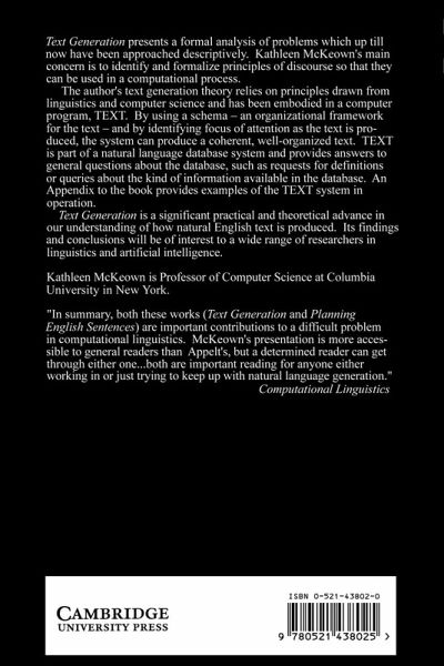 'Text Generation' presents a formal analysis of problems which up till now have been approached descriptively. Kathleen McKeown's main concern is to identify and formalize principles of discourse so that they can be used in a computational process. This makes it a significant practical and theoretical advance in our understanding of how natural English text is produced. Its findings and conclusions will be of interest to a wide range of researchers in linguistics and artificial intelligence.