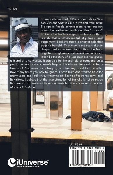 There is always a lot of Press about life in New York City and what it's like to live and work in the Big Apple. People cannot seem to get enough about the hustle and bustle and the "rat race" that as city-dwellers engulf us almost daily. It is a life that is not always full of glamour and excitement. I believe there is another side that begs to be told. That side is the story that is deeper and more meaningful than the front page tales of glamour and occasional mayhem. It can be the story of a kind next door neighbor, a friend or a co-worker. It can also be the sad tale of someone on a public conveyance who needs help and is always there asking for a hand-out. Someone you always give a helping hand to no matter how many times you vow to ignore. I have lived and worked here for many years and I still enjoy what the city has to offer its residents and its visitors. I believe that the true attraction of this city is not so much its streets, its avenues or its monuments but the stories of its people. Maurice P. Fortune