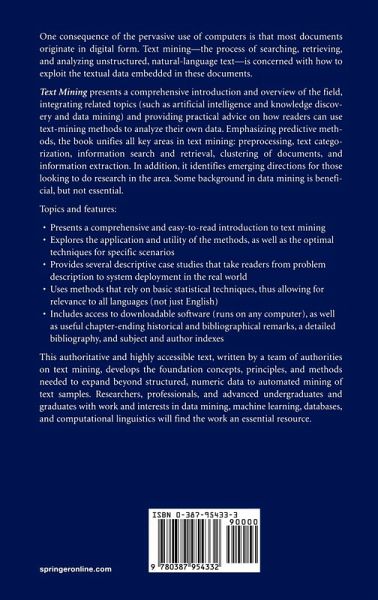 The growth of the web can be seen as an expanding public digital library collection. Online digital information extends far beyond the web and its publicly available information. Huge amounts of information are private and are of interest to local communities, such as the records of customers of a business. This information is overwhelmingly text and has its record-keeping purpose, but an automated analysis might be desirable to find patterns in the stored records. Analogous to this data mining is text mining, which also finds patterns and trends in information samples but which does so with far less structured-though with greater immediate utility for users-ingredients. This book focuses on the concepts and methods needed to expand horizons beyond structured, numeric data to automated mining of text samples. It introduces the new world of text mining and examines proven methods for various critical text-mining tasks, such as automated document indexing and information retrieval and search. New research areas are explored, such as information extraction and document summarization, that rely on evolving text-mining techniques.